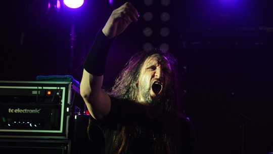 After a relatively short period, Tom Hunting entered high fiving everyone resting on the edge of the stage, before mounting his drum kit in celebration of the bands long awaited return. Once the remaining members of the group had made their way into position, Steve Souza insisted that there be "violence tonight" but on a lighter note, made sure to remind everyone to "look after each other".